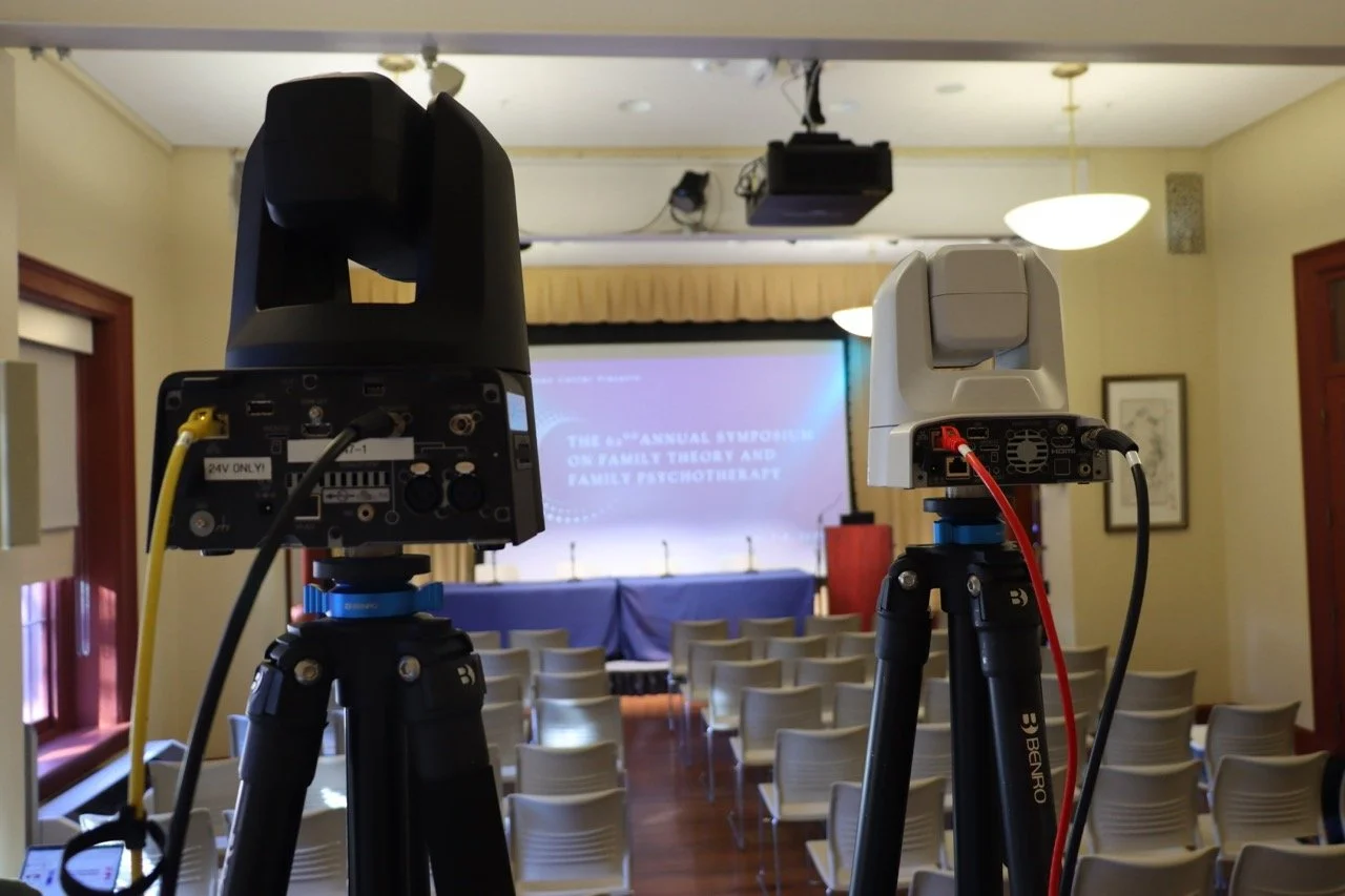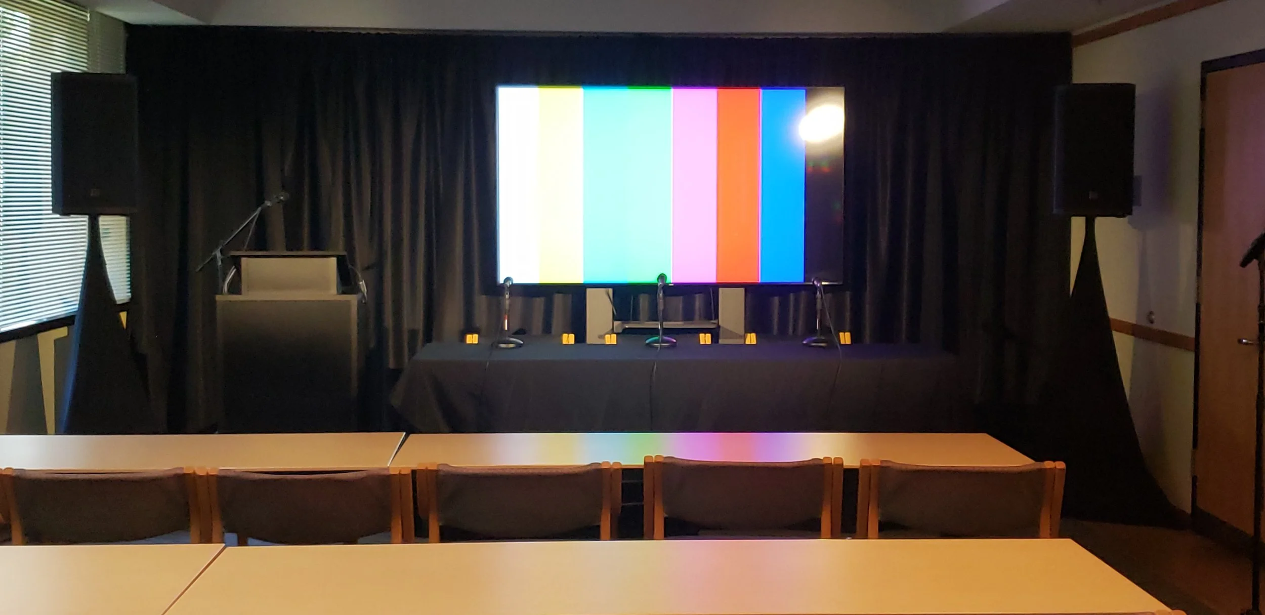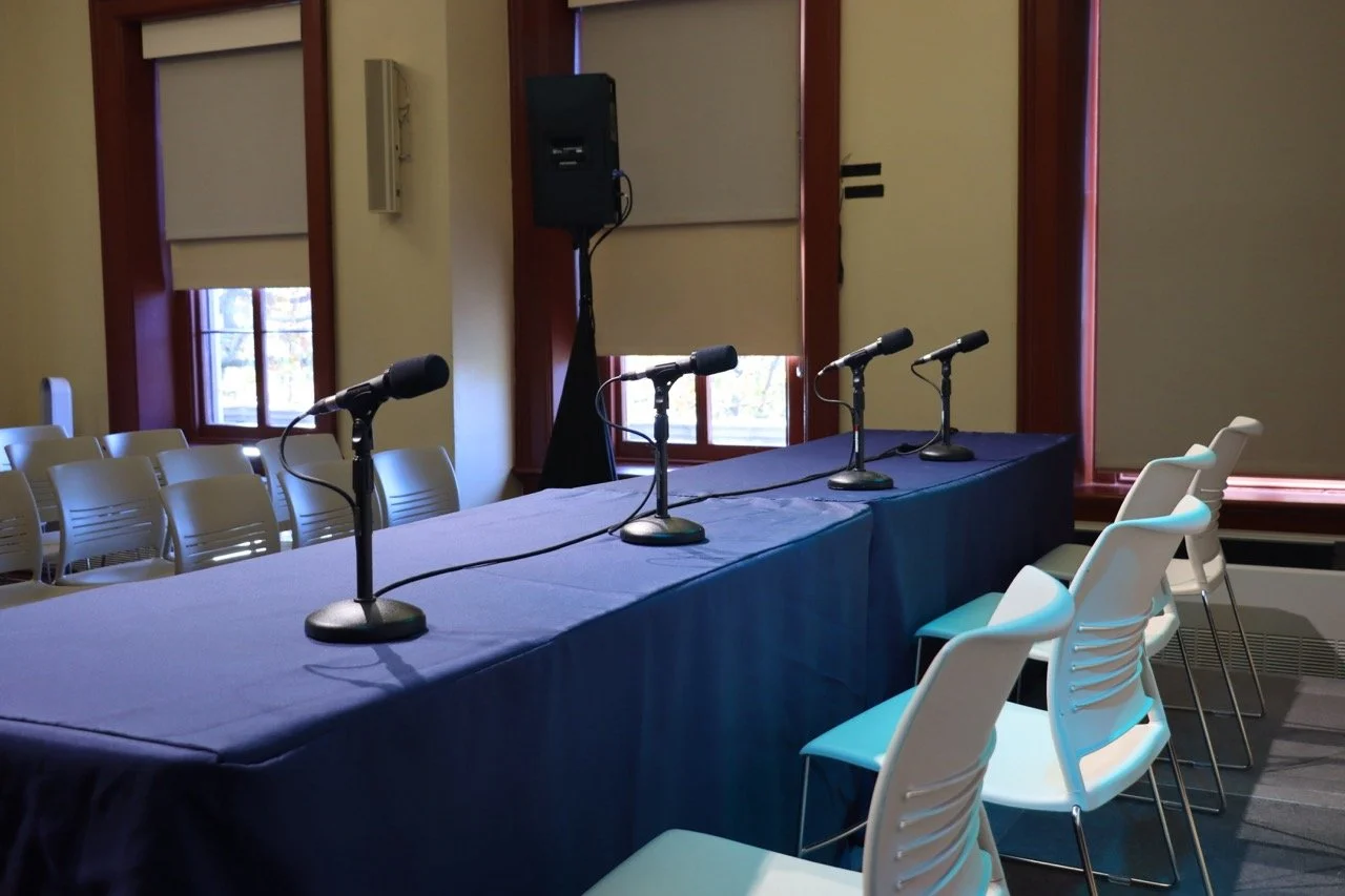 Showing that with thoughtful planning and a bit of drape, even the smallest of rooms can house a production. Looks Great provided a full audio and hybrid conferencing setup and even lighting for this conference event that got moved into a small boardroom.