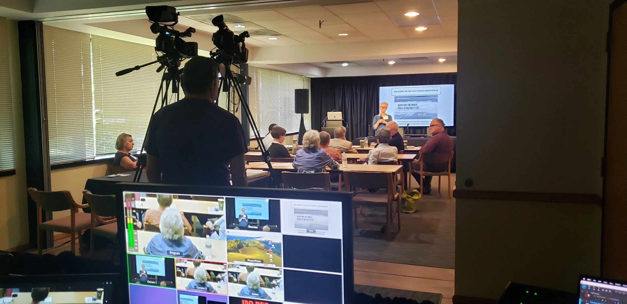 Looks Great provided audio support, a presentation system with remote control, video playback, zoom hybrid conferencing and virtual presenter support, powered by a 2-camera video deployment, recordings including split-screen and graphics, and quick deliveries for a 3-day conference.